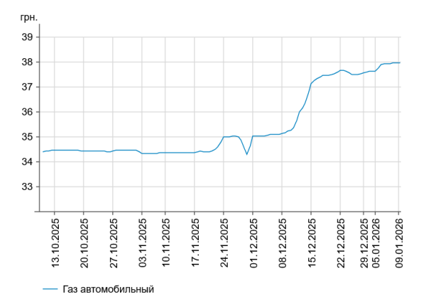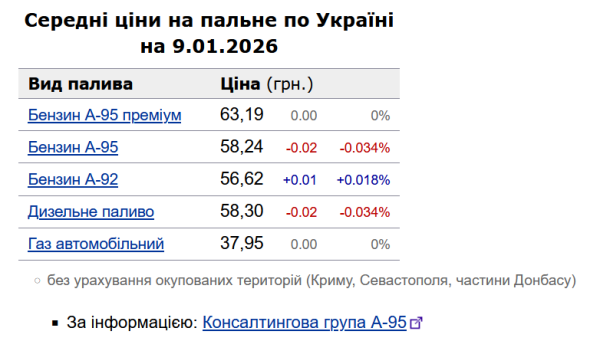 Як повідомлялося, у четвер, 8 січня, середня вартість на бензин марки А-95 збільшилася на 1 коп. до 58,26 грн/л, на дизельне пальне – також на 1 коп. до 58,32 грн/л.