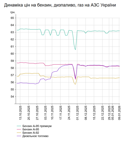 Зокрема, зафіксовані такі середні показники по цінам на пальне: бензин марки А-95 (преміум) – 63,19 грн/л; бензин марки А-95 – 58,24 грн/л (подешевшав на 2 коп.); бензин марки А-92 – 56,62 грн/л (подешевшав на 1 коп.); дизельне пальне – 58,3 грн/л (стало дешевшим на 2 коп.). Середня вартість автогазу складає 37,95 грн/л – на рівні попереднього дня.