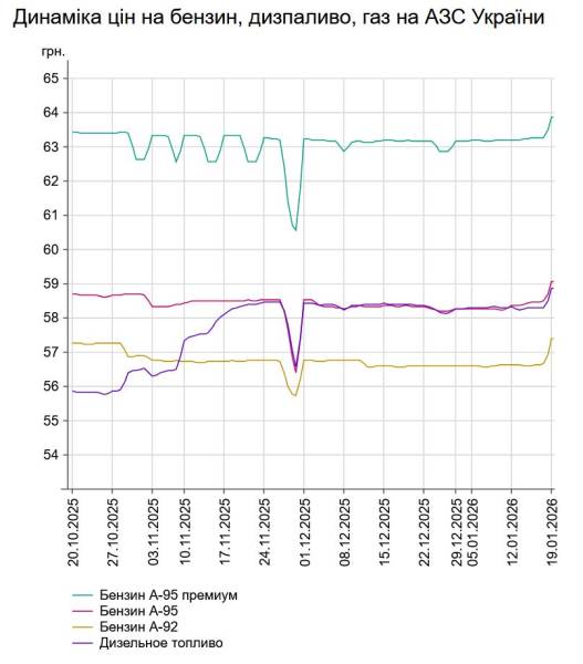 Як повідомлялося, у п'ятницю, 16 січня, середня розцінка на бензин марки А-95 піднялася на 3 коп. до 58,49 грн/л, на дизельне пальне – залишилася на позначці 58,3 грн/л.