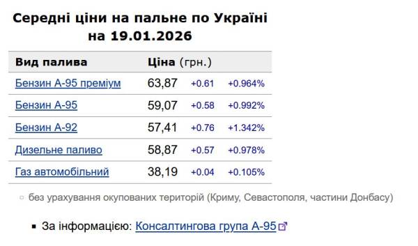 Бензин і дизель стали дорожчими майже на 60 копійок: які розцінки на АЗС 19 січня Таблиця 19.01.2026 15:06 Укрінформ У понеділок, 19 січня, середній кошторис на бензин марки А-95 зріс на 58 коп. до 59,07 грн/л, на дизельне пальне – на 57 коп. до 58,87 грн/л.
