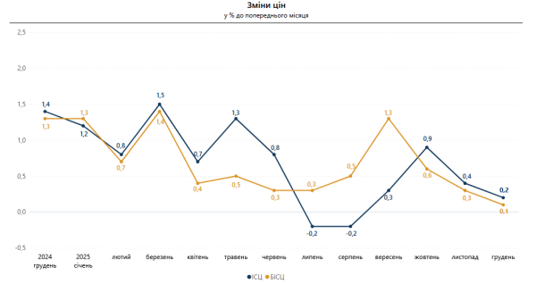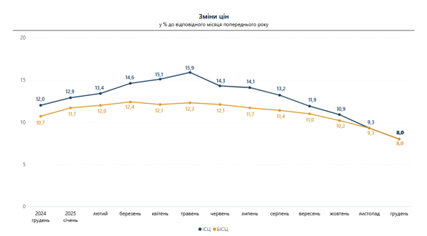 «Інфляція на споживчому ринку в грудні 2025 року у співставленні з листопадом склала 0,2%, з груднем 2024 року – 8,0%. Базова інфляція у грудні 2025 року у співставленні з листопадом склала 0,1%, з груднем 2024 року – 8,0%», – зазначено в повідомленні.