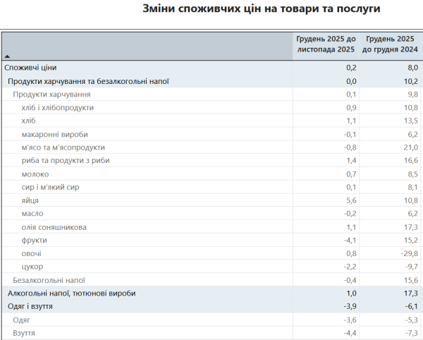 Інфляція в Україні торік впала до 8% – як змінилися розцінки на товари та послуги Таблиця 09.01.2026 15:57 Укрінформ Споживчі розцінки в Україні у грудні 2025 року збільшились у порівнянні з листопадом на 0,2%, в протиставлення грудню 2024 року – на 8%.