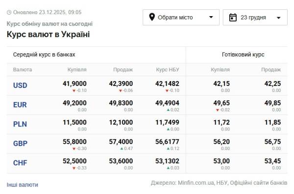 - 1 долар США – 42,14 грн (42,24 грн на 22 грудня)