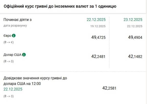 - 1 євро – 49,49 грн (49,47 грн на 22 грудня)