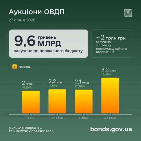 Мінфін розмістив ОВДП на ₴9,6 мільярда 27.01.2026 18:43 Укрінформ Українське міністерство фінансів 27 січня 2026 року під час торгів з продажу облігацій внутрішньої державної позики (ОВДП) залучило до держбюджету 9,6 мільярдів гривень.