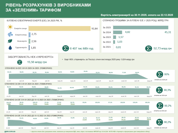 Показник розрахунків "Гарантованого покупця" з виробниками "зеленої" енергії становить: за 2025 рік – 95%, за 2024 рік – 89,3%, за 2023 рік – 99,2%, за 2022 рік – 66,2%.