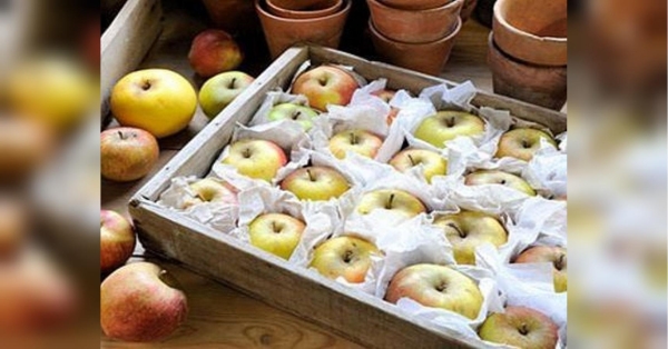Яблука можна зберігати в дерев’яних ящиках місткістю близько 15 кг. Не забудьте вистелити дно ящика газетою, бажано в два шари, перед тим, як покласти фрукти в ящик. Про всяк випадок, яблука також часто накривають газетою зверху. Це дозволяє вуглекислому газу накопичуватися під верхнім шаром газети, що ще більше гальмує процес дозрівання.