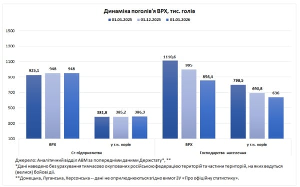 У приватному секторі утримується 856,4 тис. голів ВРХ, що на 139 тис. голів менше (-14%) у порівнянні з 1 грудня 2025 року. Чисельність корів у господарствах населення на 1 січня 2026 року становила 636 тис. голів, що на 55 тис. голів менше (-8%), ніж місяць тому. За останній рік чисельність ВРХ у господарствах населення скоротилася на 254 тис. голів (-23%), а чисельність корів зменшилась на 163 тис. голів (-20%).