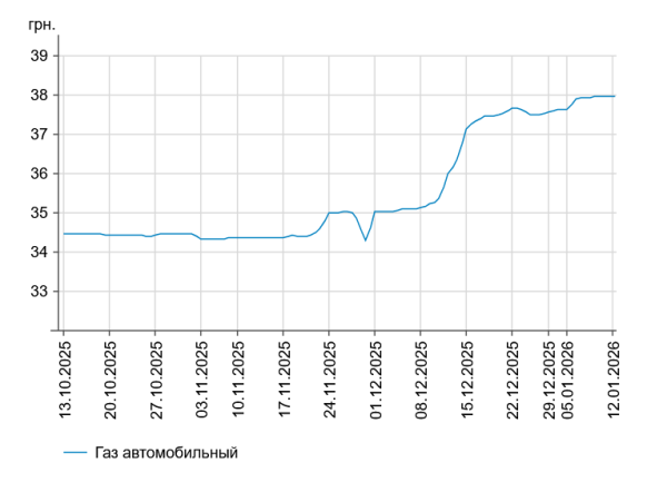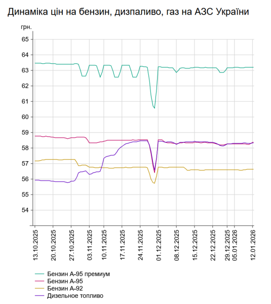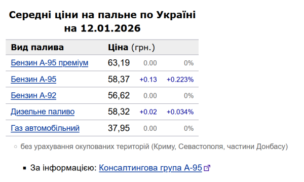 Зокрема, зафіксовані такі середні розцінки на пальне: бензин марки А-95 (преміум) – 63,19 грн/л; бензин марки А-95 – 58,37 грн/л (збільшився на 13 коп.); бензин марки А-92 – 56,62 грн/л; дизельне паливо – 58,32 грн/л (збільшилось на 2 коп.). Середня вартість автогазу становить 37,95 грн/л – на рівні попереднього робочого дня, 9 січня.