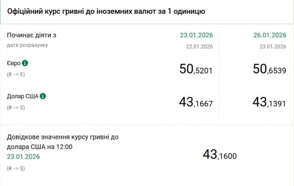 - 1 долар США – 43,13 грн (43,16 грн на 23 січня);