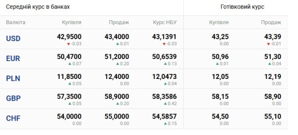 - в monobank: 42,90 – 43,28 грн/$ та 50,62 – 51,45 грн/EUR.