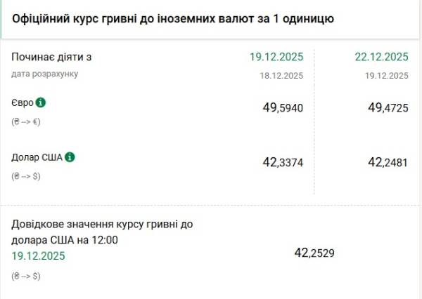 - 1 долар США – 42,24 грн (42,33 грн на 19 грудня)