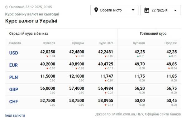 Курси долара та євро на 22 грудня Таблиця 22.12.2025 09:19 Укрінформ Долар офіційно став дешевшим на 9 копійок, євро – на 12 копійок.
