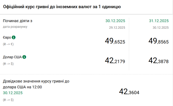 - 1 євро – 49,85 грн (49,65 грн станом на 30 грудня).