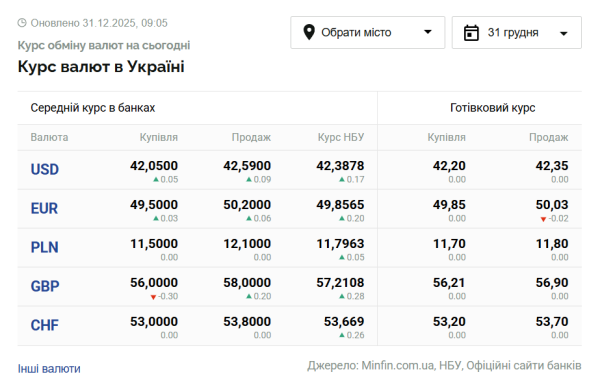 Офіційні валютні курси на середу, 31 грудня, виглядають наступним чином: