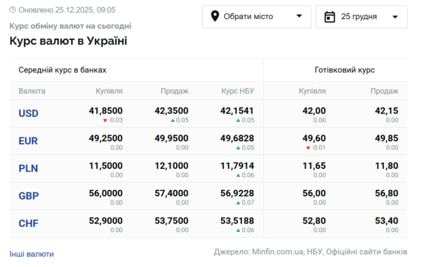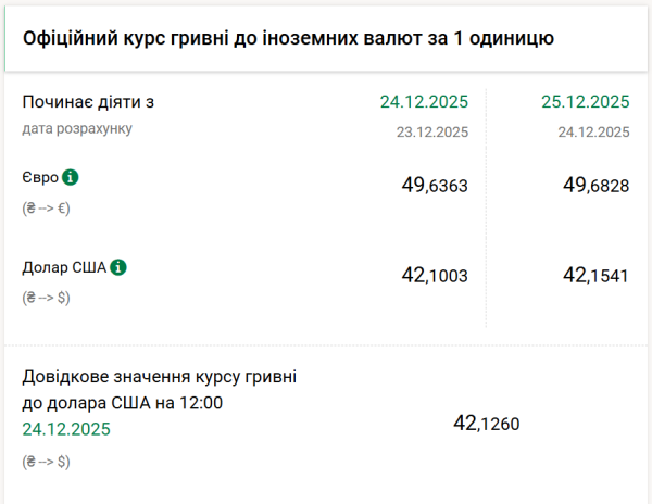1 долар США – 42,15 грн (42,10 грн на 24 грудня);
