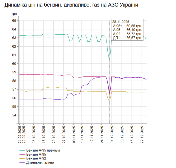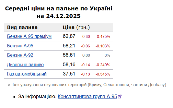 Як зазначалось, у вівторок, 23 грудня, середня вартість бензину марки А-95 зменшилася на 5 коп. до 58,27 грн/літр, дизельного пального – також на 5 коп. до 58,3 грн/літр.