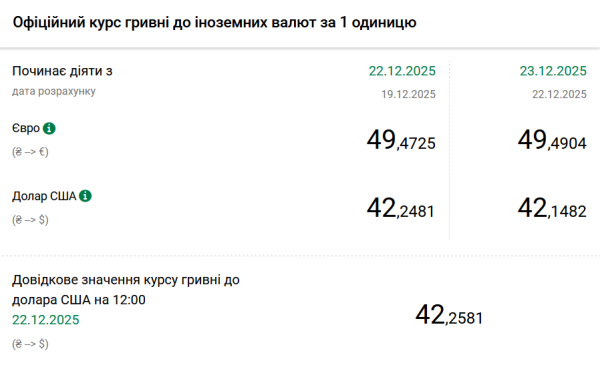 Офіційні валютні курси на вівторок, 23 грудня, будуть такими: