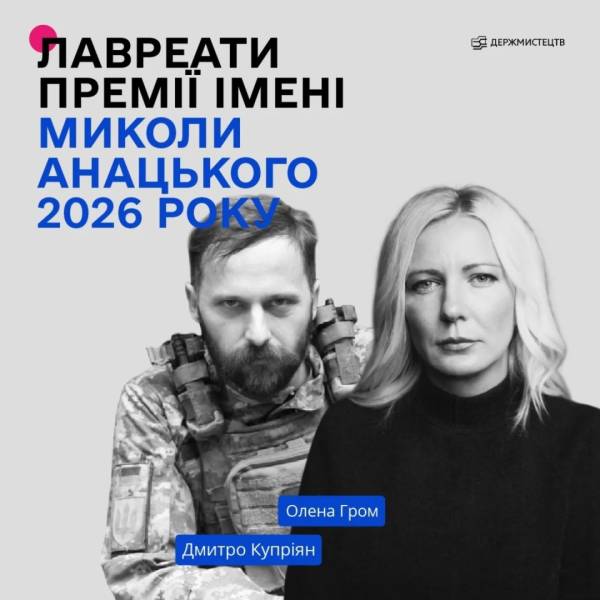 В Україні названо переможців фотопремії імені Анацького 14.01.2026 14:52 Укрінформ Дмитро Купріян та Олена Гром стали володарями нагороди в галузі фотомистецтва імені Миколи Анацького у 2026 році.