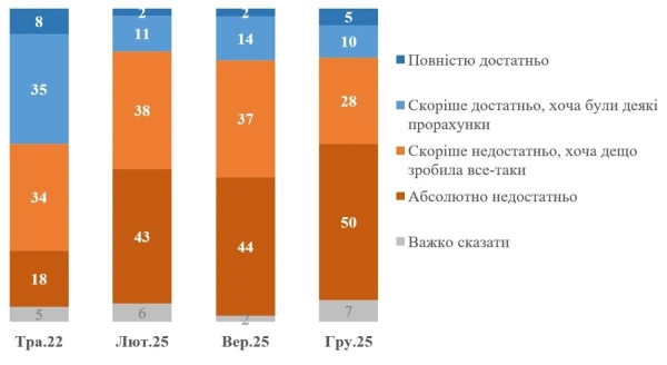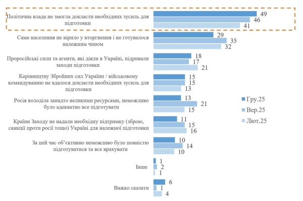 Найбільша кількість респондентів вказували на те, що політичній владі не вдалось докласти необхідних зусиль: 49% серед тих, хто вважає, що Україна не була готовою; у вересні 2025 року їх було 46%, а в лютому – 41%, тобто спостерігається тенденція до збільшення протягом року.