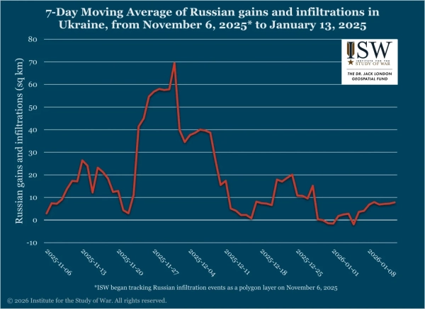 Наступ росіян сповільнився наприкінці грудня 2025 року та на початку січня 2026 року – ймовірно, з причини менш сприятливих погодних умов та припинення намагань дотримуватися “умовних строків” наприкінці року. Про це йдеться в матеріалі Інституту вивчення війни (ISW), передає УНН.