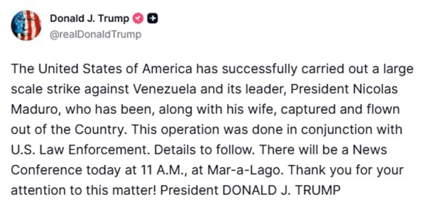 Президент США, Дональд Трамп, заявив про вдалу акцію супроти Венесуели, внаслідок котрої Ніколас Мадуро та його супутниця були ув’язнені та транспортовані з території держави. Інформація про акцію, що реалізована у співпраці з правоохоронними структурами США, буде викладена згодом на брифінгу.