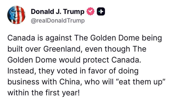 Окремою причиною для критики стала торгова політика Канади, яку Вашингтон вважає надмірно прихильною до Пекіна. Трамп застеріг канадський уряд від тісного економічного співробітництва з КНР, передбачаючи згубні наслідки для суверенітету сусідньої держави.