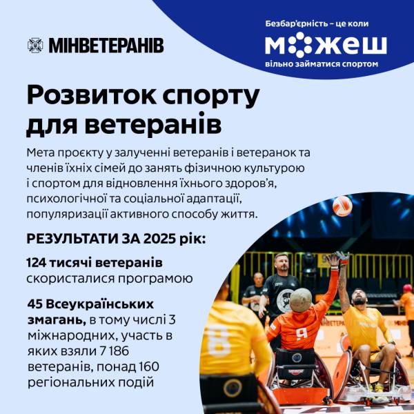 Проведено 45 всеукраїнських змагань, 10 навчально-тренувальних зборів і 166 регіональних спортивних подій. Українські ветерани гідно представляють державу й на міжнародній арені – участь у «Іграх Нескорених», Strong Spirit’s Games та чемпіонаті світу з пара-джиу-джитсу принесла команді 286 медалей, зокрема 122 золоті. Паралельно у громадах розширюється мережа безперешкодних спортивних закладів, які враховують усі потреби ветеранів. Разом із «Формулою гідного повернення» цей проєкт доповнює екосистему підтримки після завершення служби.