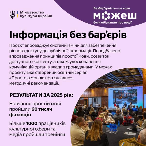 «Інформація без бар’єрів» – це ключовий проєкт Міністерства культури України, спрямований на забезпечення рівного доступу до публічної інформації через впровадження системних змін.