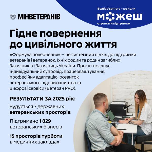 «Формула гідного повернення до цивільного життя» – головний проєкт Мінветеранів, який допомагає ветеранам, ветеранкам і їхнім сім’ям пройти шлях повернення до мирного життя. Йдеться про персональний супровід, професійну адаптацію та розвиток власної справи як опори для нового етапу життя.
