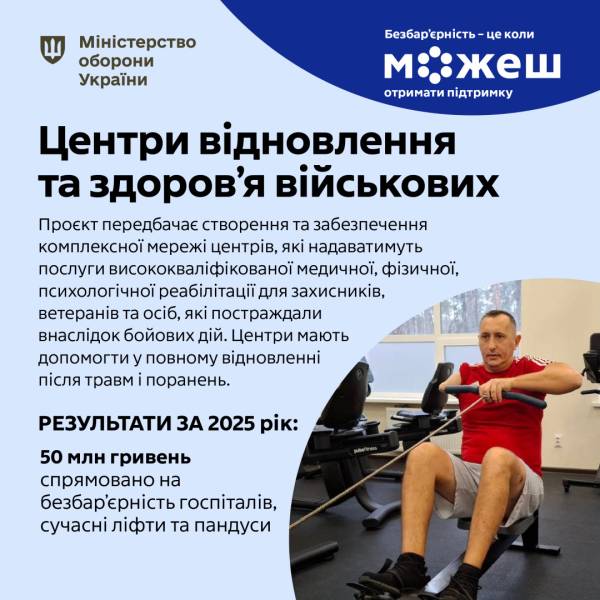 Йдеться не лише про відновлення фізичного стану, а й про психологічну підтримку та подолання наслідків пережитих подій у просторі, який не створює додаткових перепон. У 2025 році проведено комплексний аудит госпітальної мережі Міноборони щодо безперешкодності, за кошти державного бюджету розпочато практичні зміни – замінено ліфти та облаштовано пандуси на суму понад 50 млн грн.