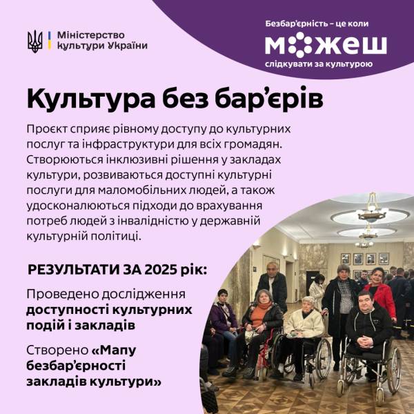 «Культура без бар’єрів» – флагманський проєкт Міністерства культури України, який трансформує культурний простір країни на основі принципів доступності та рівності. Його завдання – забезпечити рівний доступ до культурної інфраструктури й послуг та закласти єдині стандарти безперешкодних культурних послуг для музеїв, театрів та об’єктів культурної спадщини.