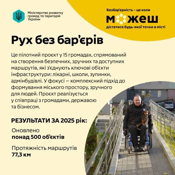 «Рух без бар’єрів» – флагманський проєкт Міністерства розвитку громад та територій України. У фокусі – поліпшення фізичної доступності громад завдяки створенню мережі безперешкодних транспортно-пішохідних маршрутів.
