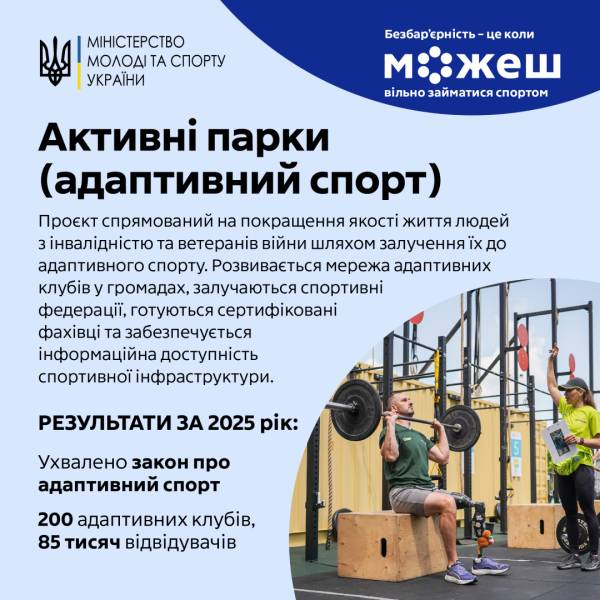 «Активні парки: локації безбар’єрного дозвілля (адаптивний спорт)» – флагманський проєкт Міністерства молоді та спорту України. Його основна ідея – допомогти ветеранам і ветеранкам, а також людям з інвалідністю покращити якість життя через рух, спорт і спільноту.