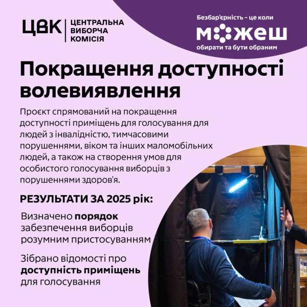 «Покращення доступності волевиявлення для людей з інвалідністю» – головний проєкт Центральної виборчої комісії, який робить виборчий процес зрозумілим, зручним і доступним для кожного громадянина. Його мета – забезпечити можливість особисто реалізувати право на голос незалежно від стану здоров’я чи віку.