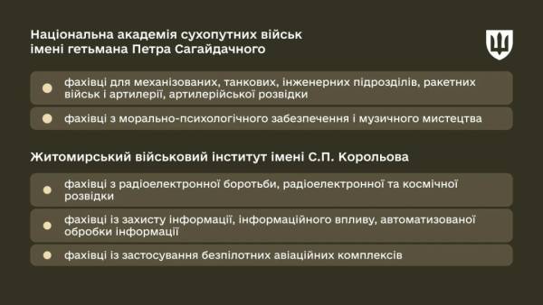 «На навчання на конкурсних засадах приймаються громадяни України віком від 17 до 30 років на основі повної загальної середньої, професійної (професійно-технічної), фахової передвищої або вищої освіти, за результатами вступних випробувань з конкурсних дисциплін безпосередньо у ВВНЗ або результатами зовнішнього незалежного оцінювання знань абітурієнтів», – зазначили в Міноборони.