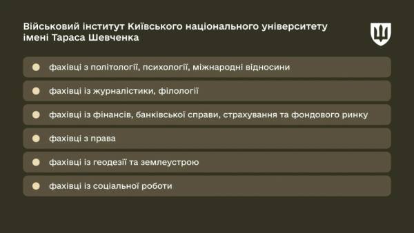 Військовий інститут Київського національного університету імені Тараса Шевченка здійснює підготовку професіоналів з повною вищою освітою за спеціальностями політологія, психологія, міжнародні відносини, журналістика, філологія, фінанси, банківська справа, страхування та фондовий ринок, право, геодезія та землеустрій, соціальна робота.