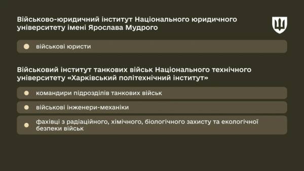 Які спеціалізації пропонують військові ВНЗ України – роз’яснення Міноборони Інфографіка 18.01.2026 05:21 Укрінформ Оборонне відомство України представило перелік спеціалізацій, за якими цьогоріч відбувається підготовка курсантів у вищих військових учбових закладах.