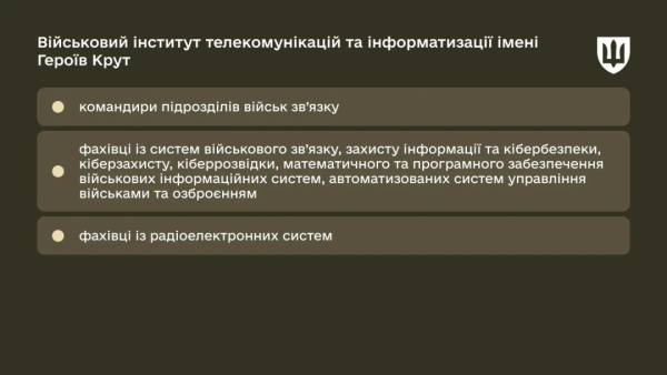 Військовий інститут телекомунікацій та інформатизації імені Героїв Крут здійснює підготовку командирів підрозділів військ зв’язку, спеціалістів із систем військового зв’язку, захисту інформації та кібербезпеки, кіберзахисту, кіберрозвідки, математичного та програмного забезпечення військових інформаційних систем, автоматизованих систем управління військами та озброєнням, а також спеціалістів із радіоелектронних систем.