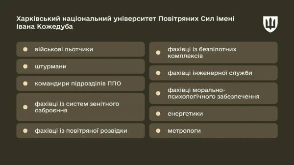 Харківський національний університет Повітряних сил імені Івана Кожедуба готує військових пілотів, штурманів, командирів підрозділів ППО, спеціалістів з систем зенітного озброєння, повітряної розвідки, безпілотних комплексів, інженерної служби, морально-психологічного забезпечення, а також енергетиків і метрологів.
