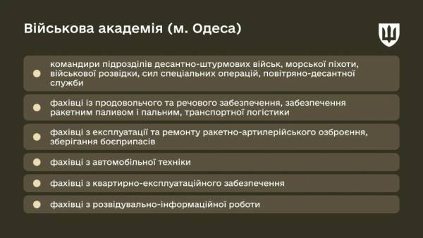 Військова академія (м. Одеса) здійснює підготовку командирів підрозділів десантно-штурмових військ, морської піхоти, військової розвідки, сил спеціальних операцій, а також спеціалістів з повітряно-десантної служби, продовольчого та речового забезпечення, забезпечення ракетним паливом і мастилом, транспортної логістики, експлуатації та ремонту ракетно-артилерійського озброєння, зберігання боєприпасів, автомобільної техніки та квартирно-експлуатаційного забезпечення. Також академія готує спеціалістів з розвідувально-інформаційної діяльності.