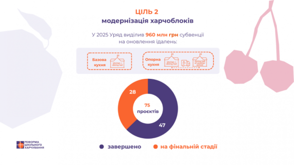 Також у державному кошторисі на 2025 рік було передбачено 960 млн грн субвенції на покращення харчоблоків, зокрема у військових і спеціалізованих ліцеях. За результатами конкурсу відібрали 79 проєктів, які виконають до кінця року.