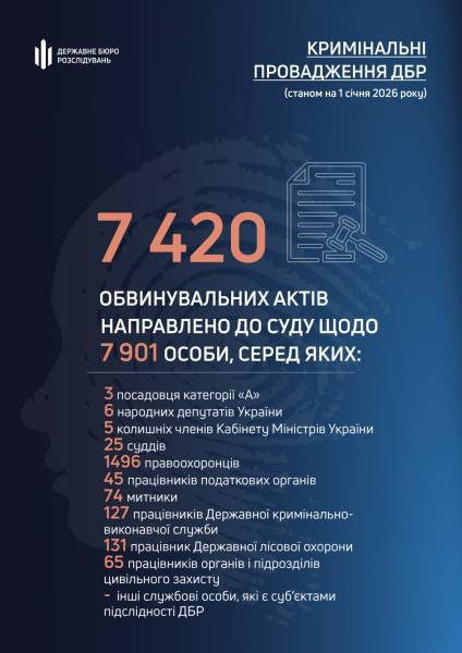 У 2025 році за результатами розслідувань ДБР до суду було відправлено 7 тис. 420 обвинувальних актів стосовно 7 тис. 901 особи.