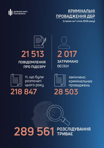 Окрім того, за минулий рік працівники ДБР оголосили про підозру 21 тис. 513 фігурантам розслідувань та затримали 2 тис. 017 осіб.