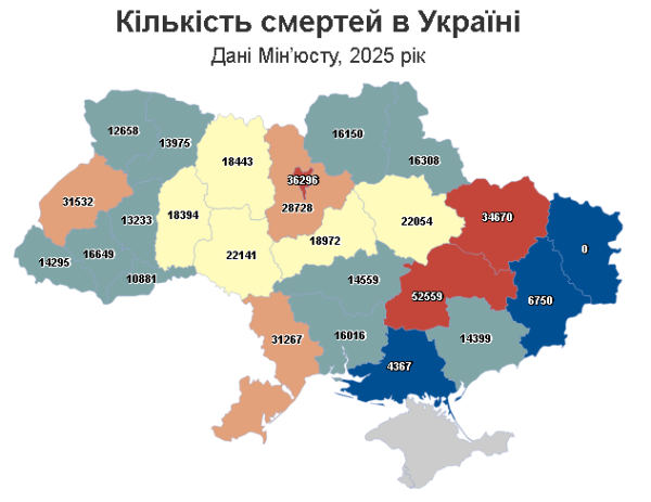 Найбільшу кількість смертей зафіксували на Дніпропетровщині (52 559), у Києві (36 296) та на Харківщині (34 670).