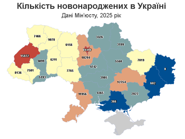 Найбільше дітей традиційно народилося у Києві — 19 410 новонароджених або 11,5% від загальної кількості. При цьому, підкреслюється, "столиця втратила лише 1,5% у порівнянні з 2024 роком". На другій позиції Львівщина — 15 872 немовлят, на третій — Дніпропетровщина: 12 754 дитини.