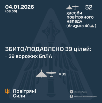 Згідно з попередніми відомостями, за станом на 08:00, протиповітряною обороною збито/приглушено 39 ворожих БпЛА типу Shahed, Гербера та інших видів дронів на півночі та сході країни.