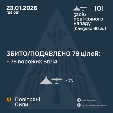 За інформацією від Повітряних сил ЗСУ, упродовж ночі з 22 на 23 січня російські окупанти здійснювали наступ на мирних жителів українських міст та сіл за допомогою 101 ударного БпЛА типу Shahed (включно з реактивними), Гербера та інших різновидів безпілотників.