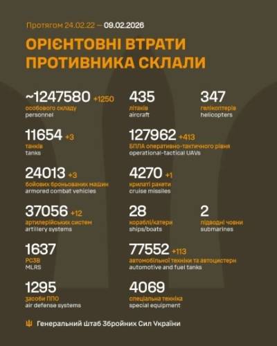 Сукупні бойові втрати російських військ з 24 лютого 2022 року до 9 лютого 2026 року у війні проти України сягають близько 1 247 580 осіб, з них 1 250 осіб — за останню добу.