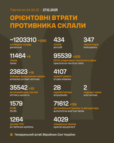 Сумарні бойові втрати супротивника з 24.02.22 по 27.12.25 приблизно становлять: